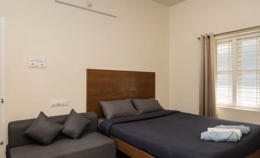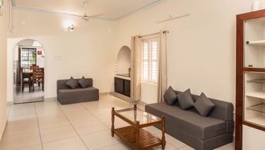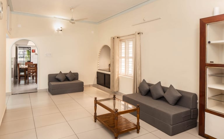 Spacious living area at Chitralayam Homestay is thoughtfully designed for comfort and togetherness. Bright, airy, and neatly arranged, it offers a relaxing space for families to unwind after temple visits. The living room features comfortable seating along with an additional sofa bed, making it ideal for accommodating extra guests. Its calm ambience is perfect for conversations, prayer, or quiet relaxation, while the open layout ensures ample space for everyone to move freely. This welcoming living area truly enhances the feeling of staying in a home away from home.