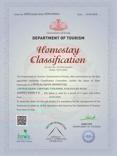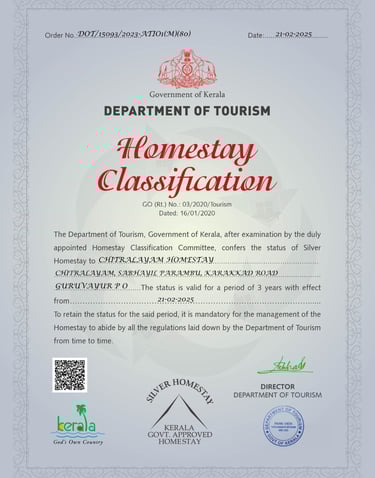 We take pride in being approved by Kerala Tourism as a Silver Category Homestay, which reflects our commitment to quality, cleanliness, safety, and guest satisfaction. This recognition assures our guests of a reliable and well-maintained accommodation that meets official tourism standards.